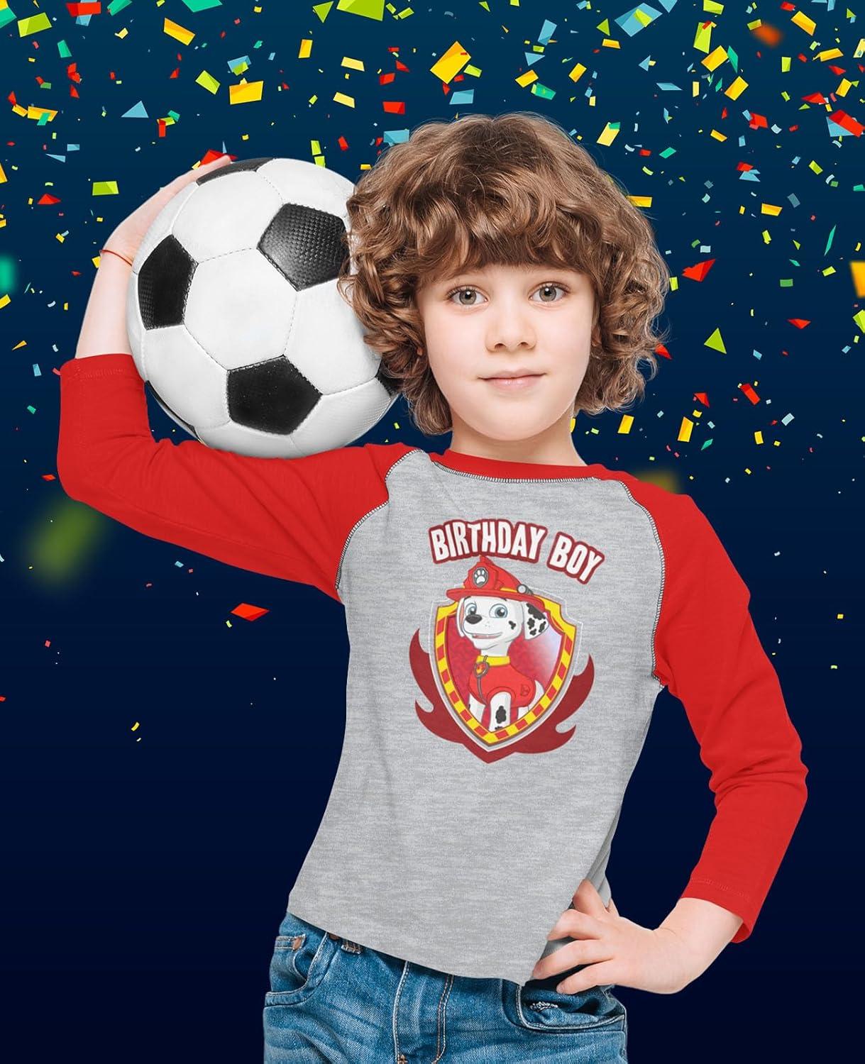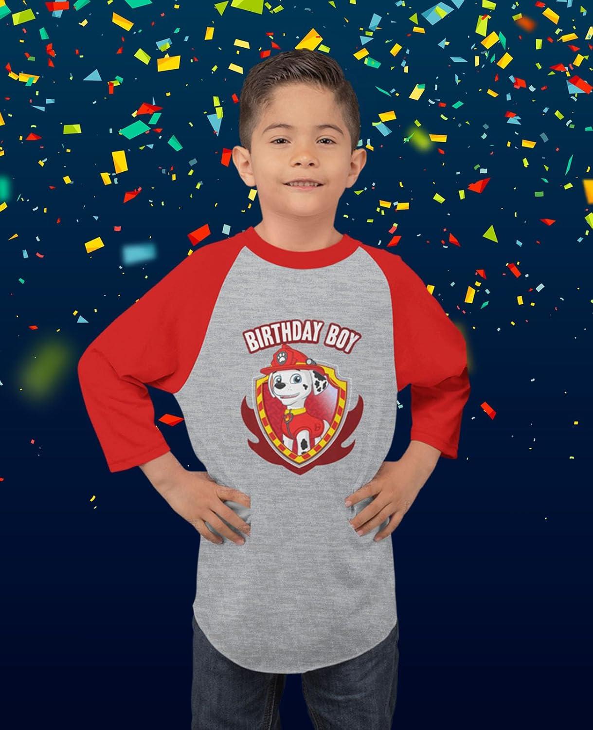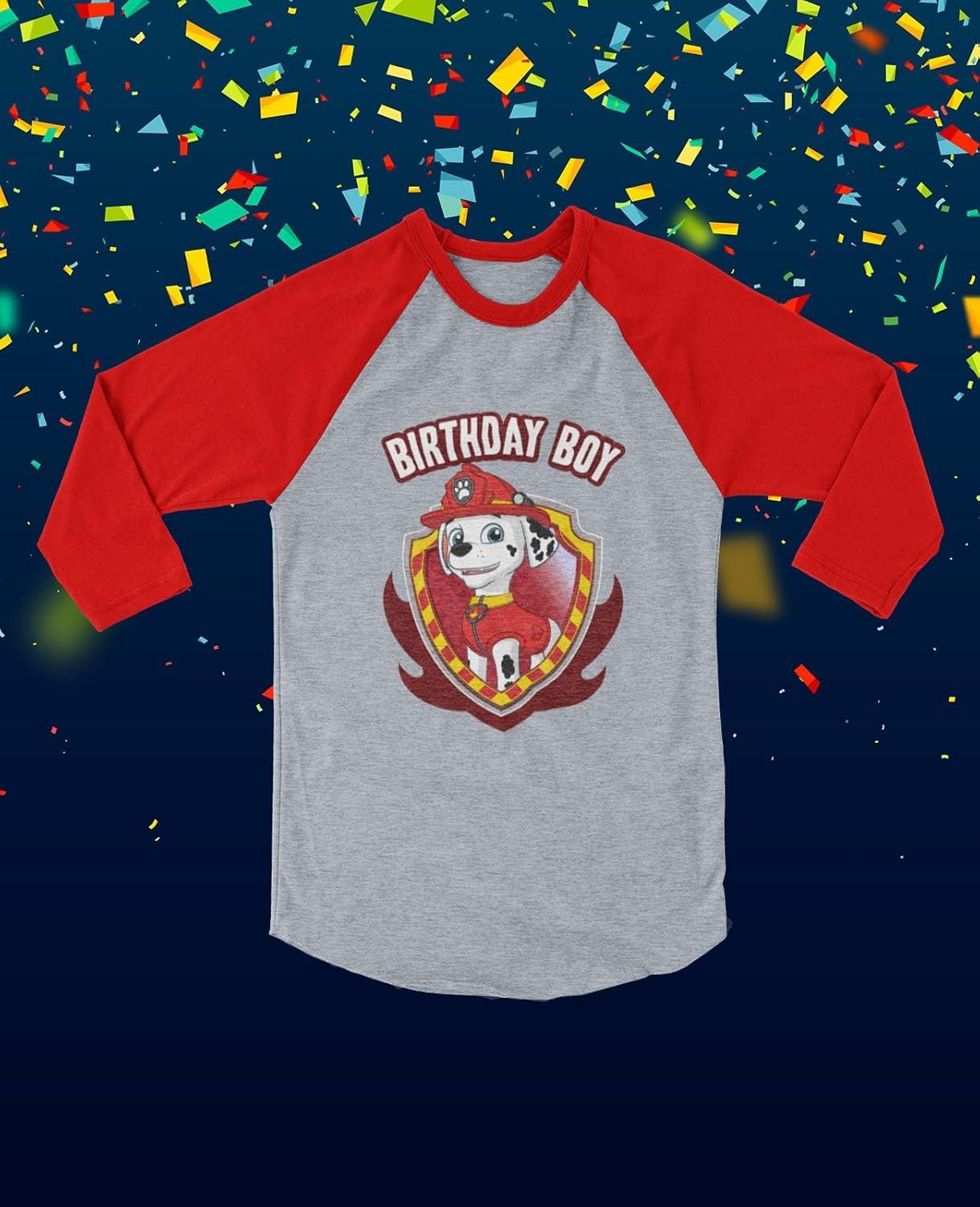 Let your little slugger celebrate his big day in style with the Marshall 4th Birthday Baseball Shirt. This 3/4 sleeve jersey features Marshall from Paw Patrol, ready to join the party and cheer on the birthday boy. Designed for toddler boys turning four, it's ideal for Paw Patrol-themed parties, school celebrations, or a fun day at the ballpark. Made from soft, breathable fabric, this shirt keeps kids comfortable while they run, play, and pose for birthday photos. The sporty baseball style with raglan sleeves adds a playful touch that parents and kids love. It's an easy, thoughtful gift for any Paw Patrol fan — and a keepsake that will remind them of their special 4th birthday.