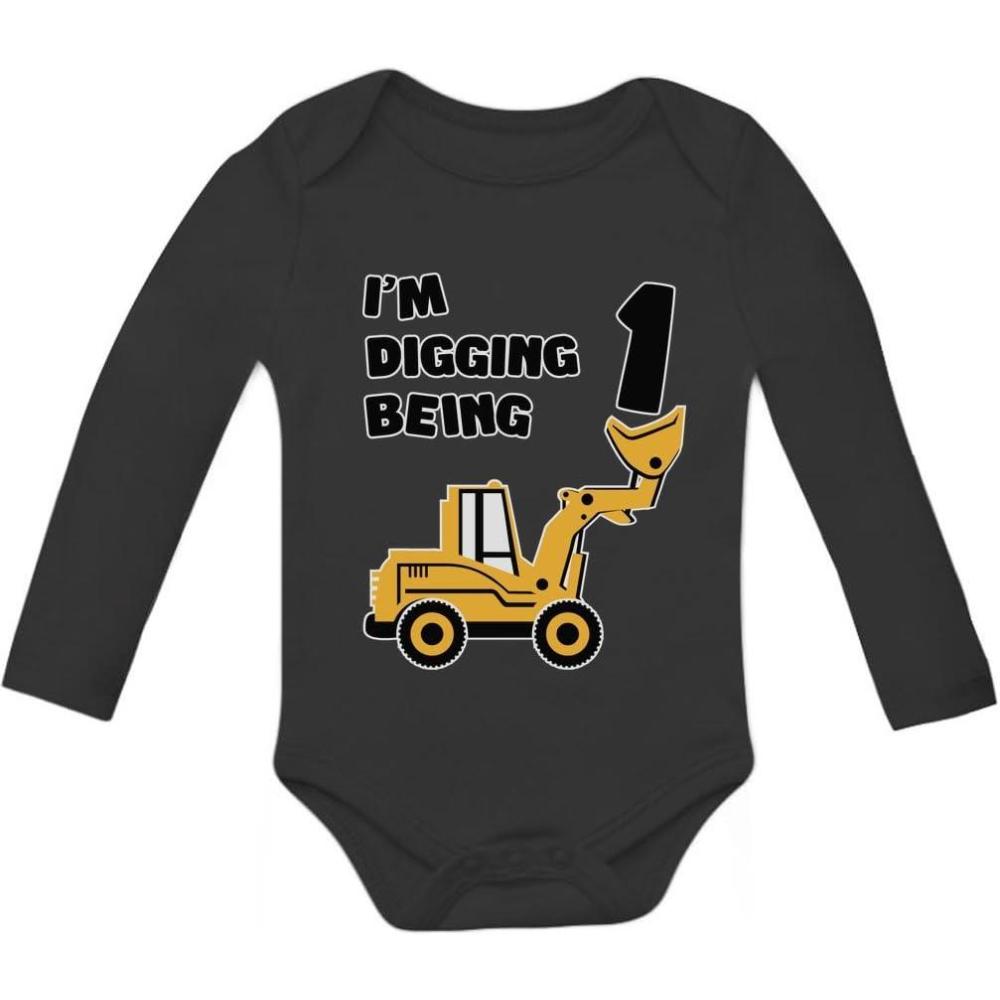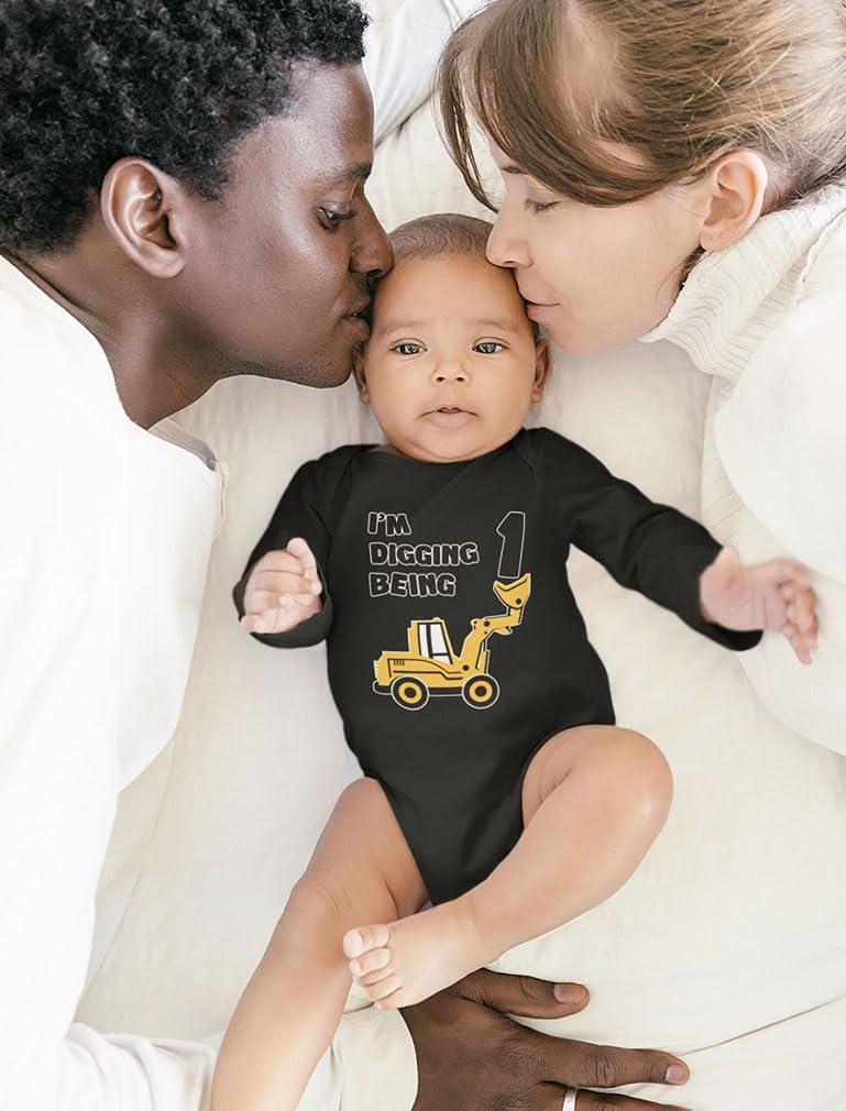 Celebrate your little builder's big day with this “I'm Digging Being 1” construction truck bodysuit! Designed for baby boys and girls, this adorable long sleeve outfit combines playful style with cozy comfort. The bold truck graphic makes it a fun choice for birthday photos, family parties, or everyday wear. Made with soft, breathable fabric, it keeps your baby comfortable through every giggle, crawl, and cake smash. It's also a sweet birthday gift idea for parents or grandparents celebrating a first birthday milestone. From party time to photo time, this bodysuit brings cheerful energy and cuteness to every 1st birthday celebration.