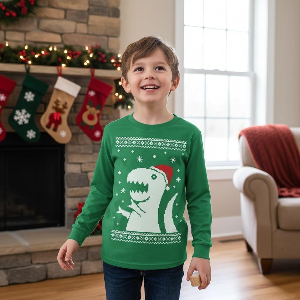 Tstars Kids Tree Rex Christmas Shirt Funny Ugly Sweater Style Holiday Dino Long Sleeve Tee for Toddlers(Dino / Green)