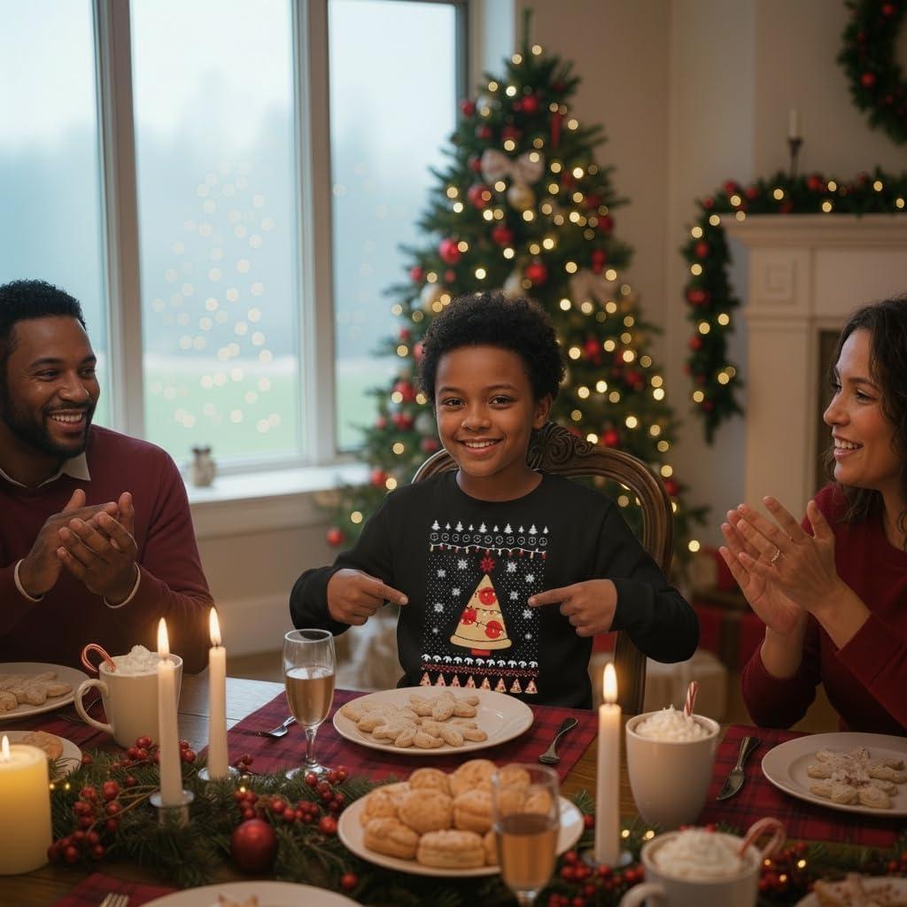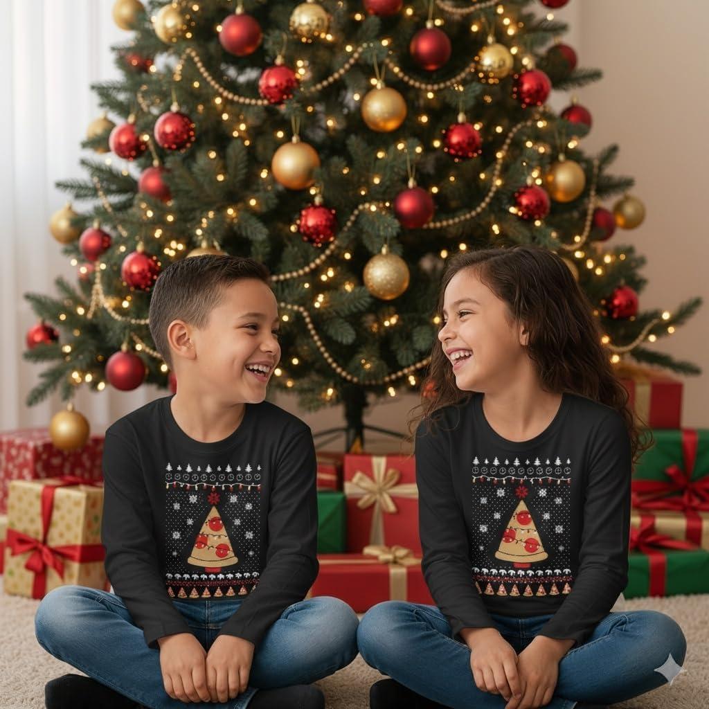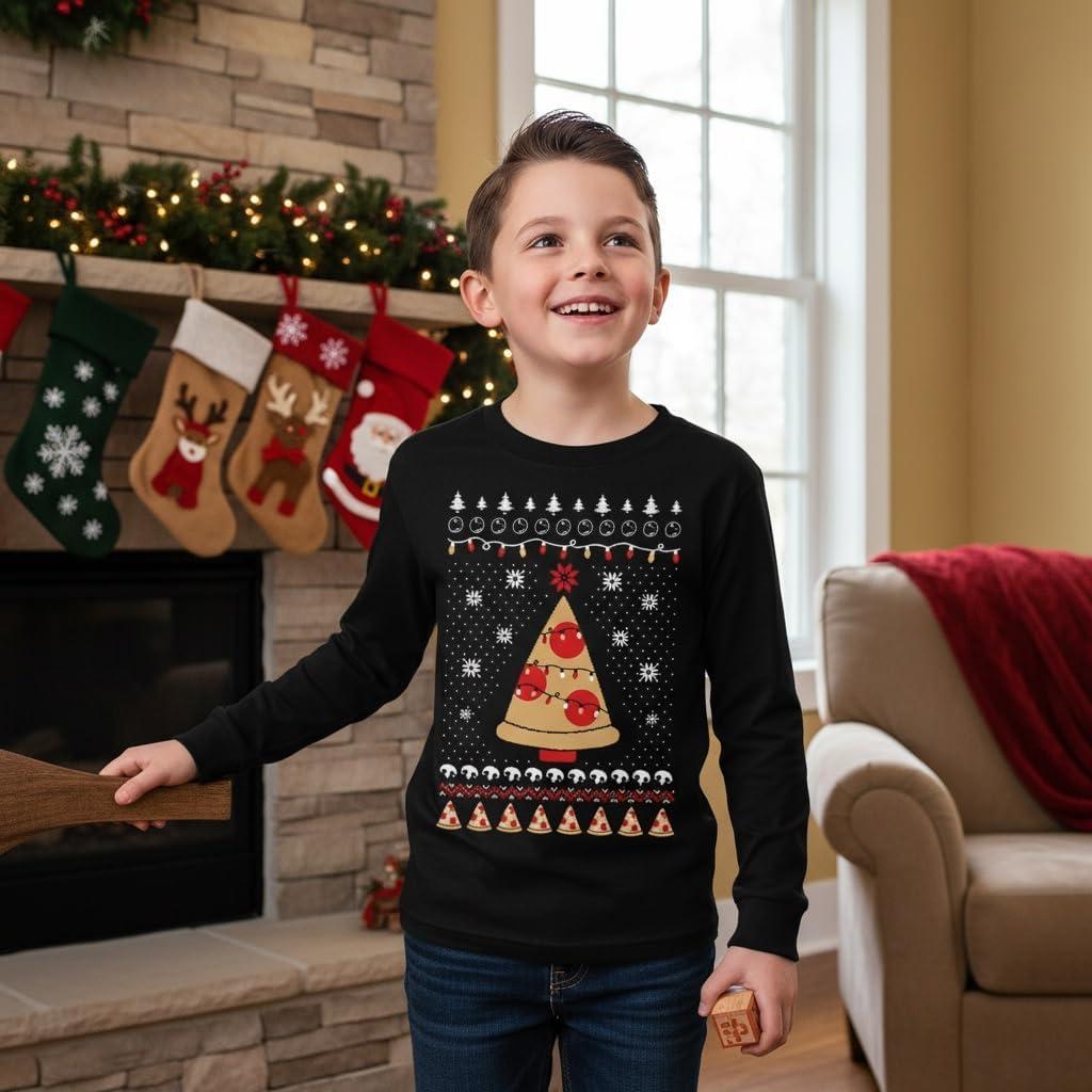 Tstars Merry Swishmas Boys Basketball Shirt – Funny Ugly Christmas Sweater Style Youth Long Sleeve Holiday Tee(Pizza / Black)