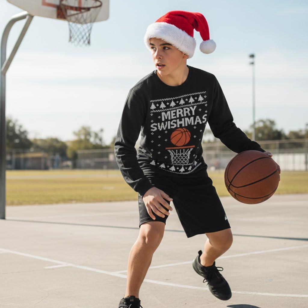 Tstars Merry Swishmas Boys Basketball Shirt – Funny Ugly Christmas Sweater Style Youth Long Sleeve Holiday Tee(Swishmas / Black)