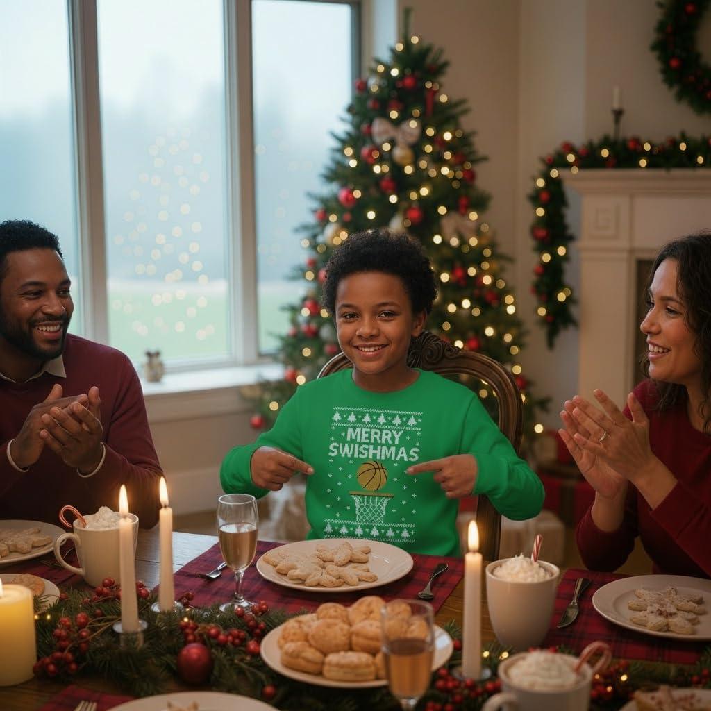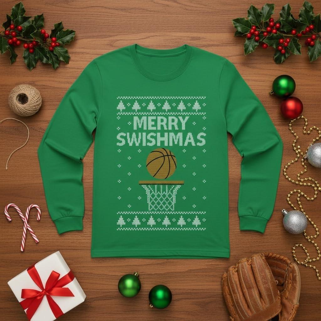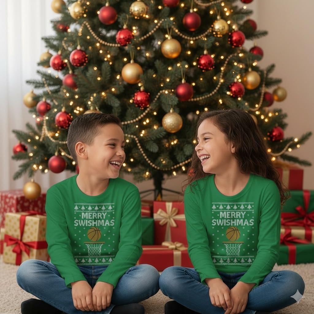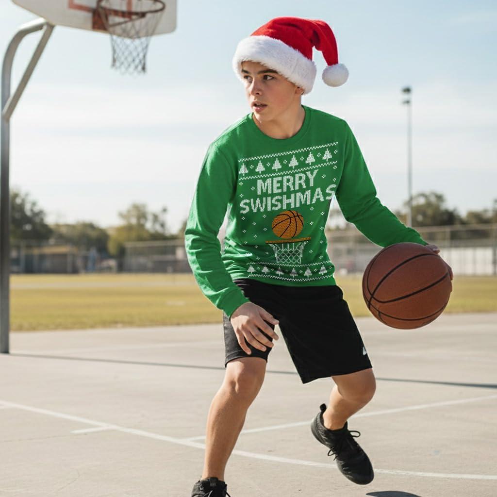 Tstars Merry Swishmas Boys Basketball Shirt – Funny Ugly Christmas Sweater Style Youth Long Sleeve Holiday Tee(Swishmas / Green)